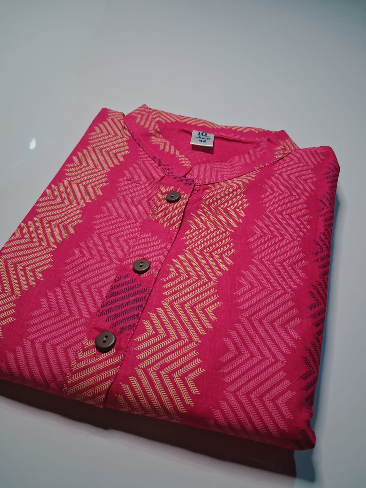 উজ্জ্বল পিঙ্ক, পার্পল এবং গোল্ডেন বেইজ কালারের স্ট্রাইপ ডিজাইনে তৈরি এই প্রিমিয়াম কটন কুর্তিটি আপনার ফ্যাশনে যোগ করবে এক নতুন মাত্রা। মান্দারিন কলার (Mandarin Collar) এবং সামনে বোতামের নিখুঁত কাজ এটিকে দিয়েছে একটি ফরমাল অথচ ট্রেন্ডি লুক। আরামদায়ক সুতি কাপড় এবং জিগ-জ্যাগ প্যাটার্নের ব্লেন্ড আপনাকে যেকোনো আউটিং বা কর্মক্ষেত্রে দিনভর ফ্রেশ ও কনফিডেন্ট রাখবে। জিন্স, জেগিংস বা সাদা প্যান্টের সাথে এই কুর্তিটি দারুণ মানিয়ে যায়।